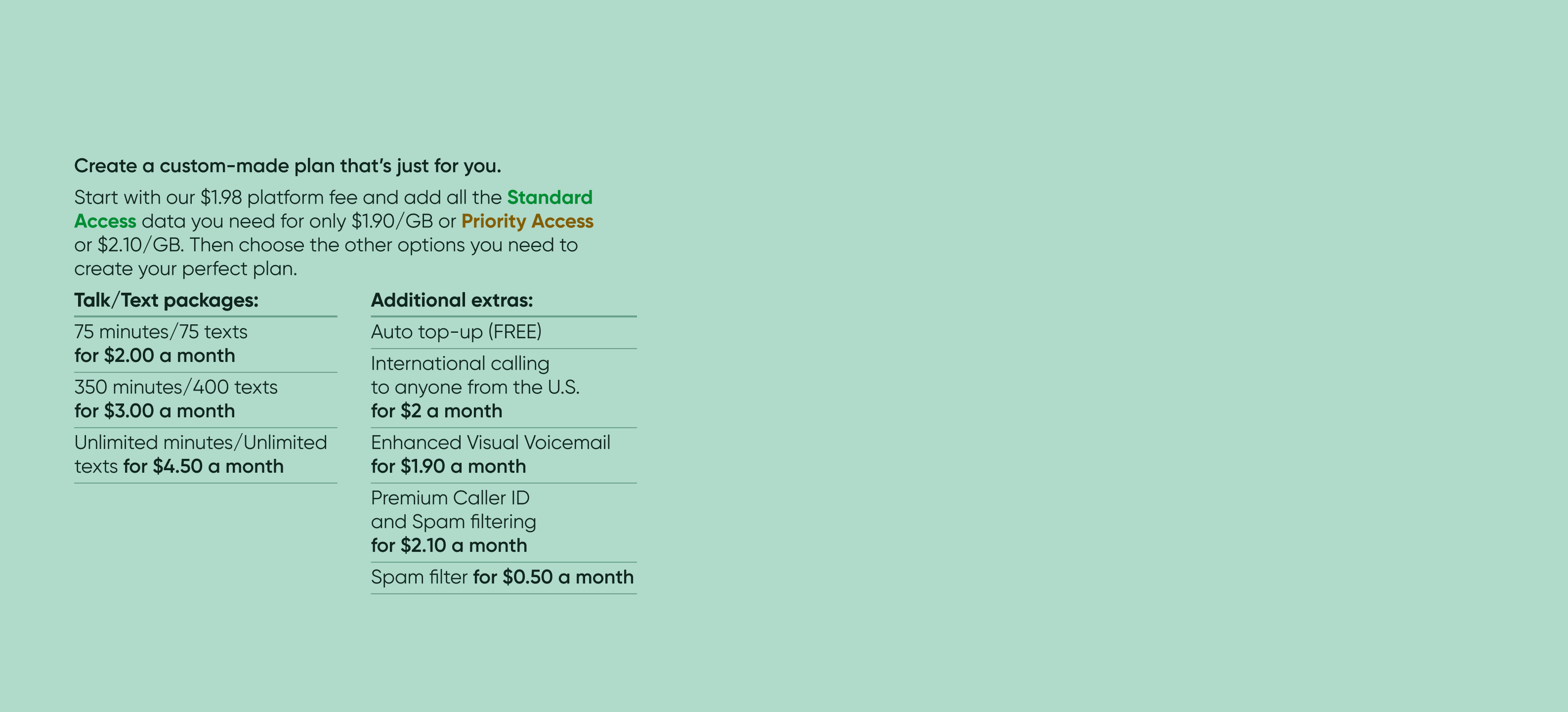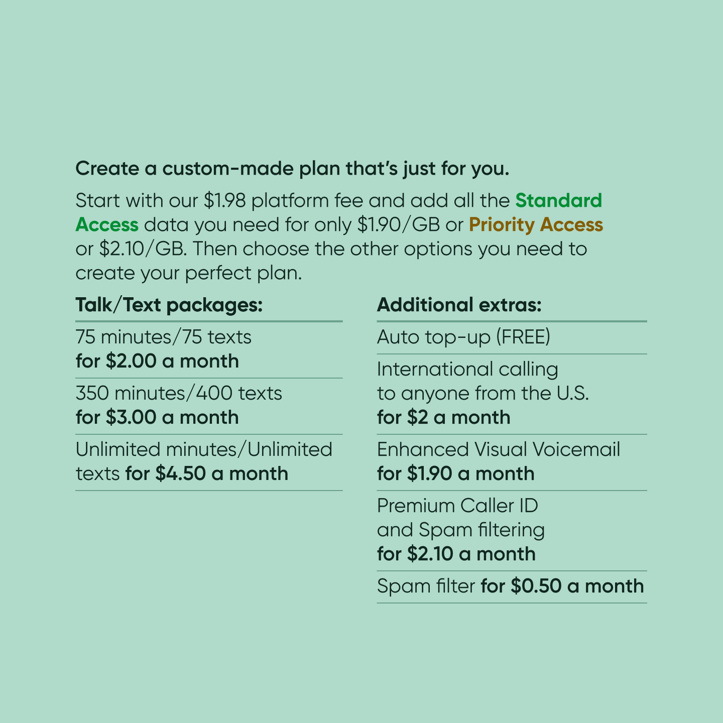 Either Personalized Access, starting from as little as $3.88 a month for a data plan, or $3.98 a month for a talk/text plan. Or to one of our feature-rich, best in-market Unlimited plans, below.